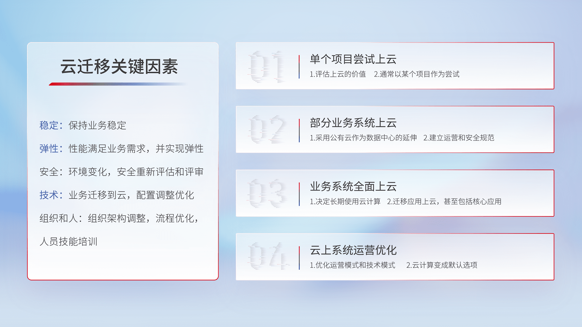 结合实际业务,,从规划设计、、、、云平台选型、、云原生改造、、、、数据迁移、、集成交付,,,,迁移全过程为客户识别最佳上云路径,,,做好风险识别管理,,,,设计网络架构、、身份权限、、、、安全审计合规、、、操作审计、、日志审计、、监控告警策略、、多站点容灾设计等,,,,对云上基础设施进行整体规划,,,,提升IT治理水平,,,以满足弹性、、高可用、、、、高性能的需求。。。。