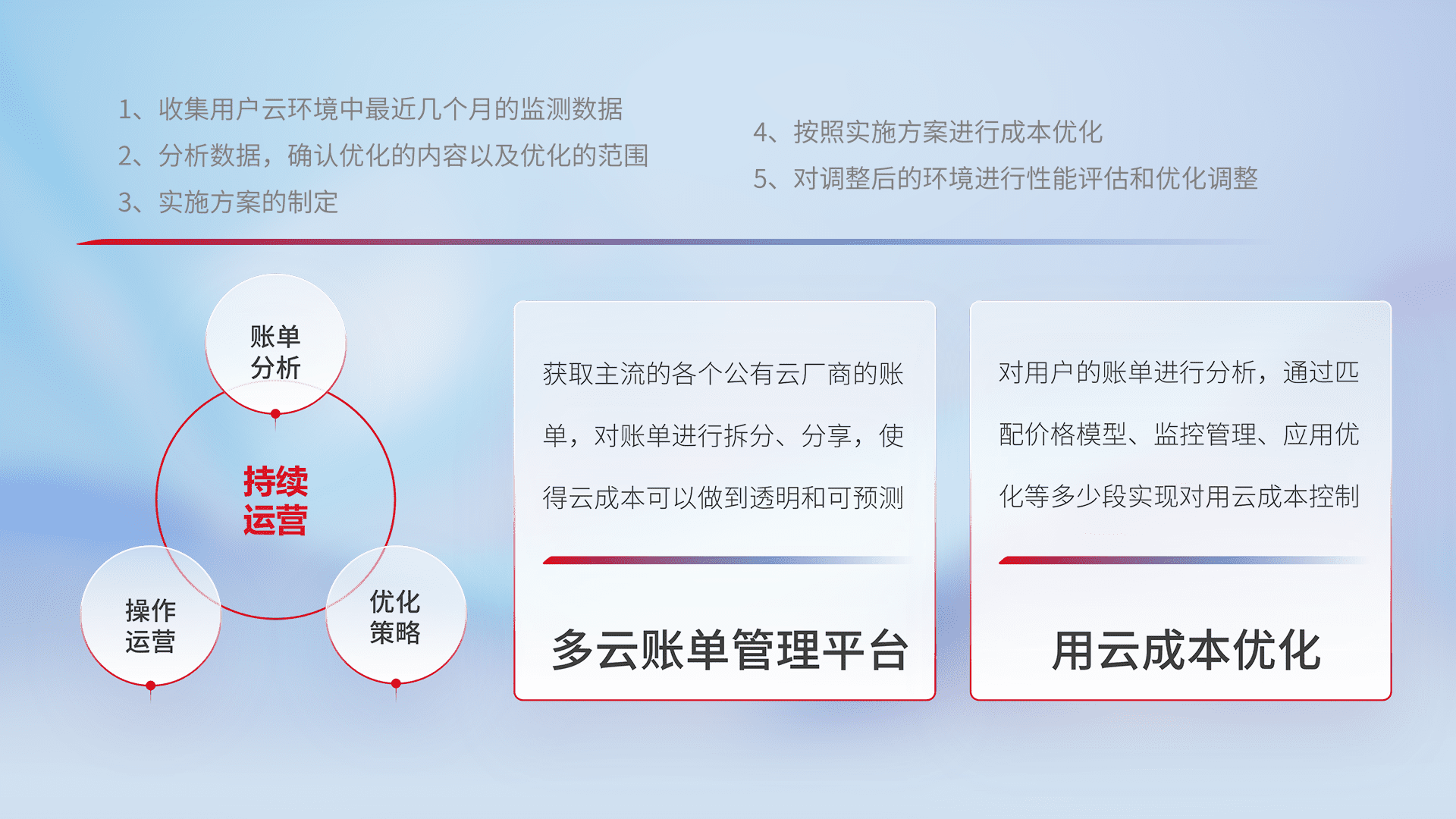 通过灵活运用多种自动化迁移工具,,,帮助企业用户实现业务和数据高效 、、、、稳定的上云迁移和云上迁移,,,采用自研多云纳管平台,,,以中立管理模式,,,解决多组织、、、多云、、、多运维厂商的复杂关系的管理,,,,保证多云平台资源配置的一致性,,,,实时掌控云资源运行数据,,,,运用智能化工具分析云资源多云平台的管理服务,,,,透明化管理成本支出,,,用云成本可预测、、、、用云费用可优化、、、云资源配额有据可依。。。